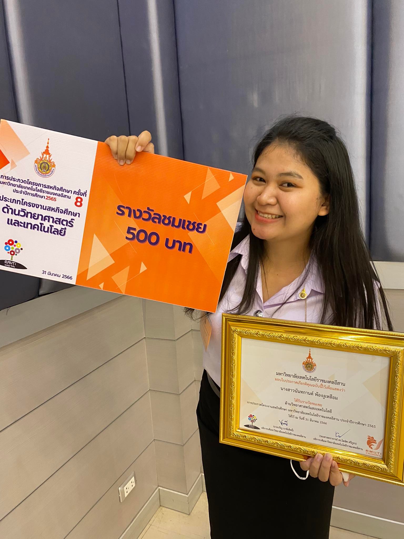 ขอแสดงความยินดี กับนักศึกษาสหกิจศึกษา ที่ได้รับรางวัลชมเชย ประเภทโครงงานสหกิจศึกษา ด้านวิทยาศาสตร์และเทคโนโลยี ในการประกวดโครงการสหกิจศึกษา มหาวิทยาลัยเทคโนโลยีราชมงคลอีสาน ประจำปีการศึกษา 2565