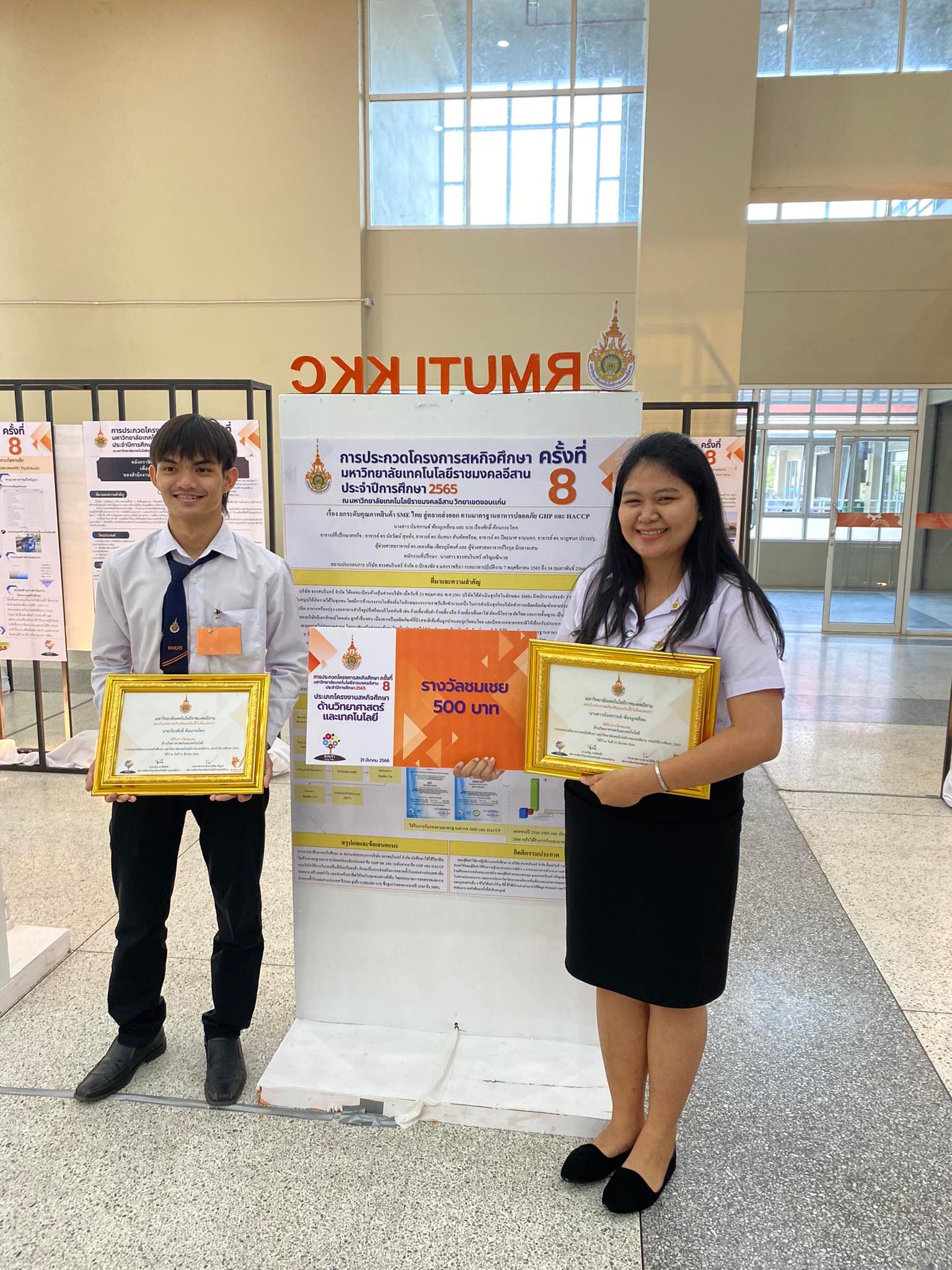 ในหัวข้อโครงงานเรื่อง "ยกระดับคุณภาพสินค้า SME ไทย สู่ตลาดส่งออกตามมาตรฐานอาหารปลอดภัย GHP และ HACCP" ร่วมกับ บริษัท ธรรศนรินทร์ จำกัด อ.ปักธงชัย จ.นครราชสีมา จัดทำโดยนักศึกษาสหกิจศึกษา 2 ท่าน ประกอบด้วย
